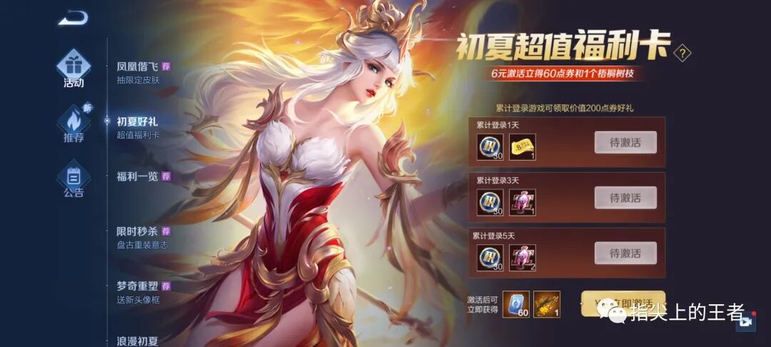 初夏超值福利卡,伴生凤凰于飞和凤求凰返场之际上线,这个卡的意思就是你买了之后,会以点券的形式返还,相当于直接冲了六元吗?接着看。