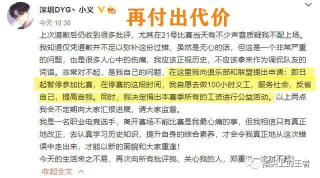 有人会说,小义道歉不过是为了想要重返赛场,或者拿到一个好名声,的确,我们不能否认这样的想法,换做是我也会考虑在道歉和声誉之间做出权衡,但是不一定能做到他这么多,如果是我,暂别赛场,可能迎来的是事业的低谷期,之后再捐掉工资,那可能就啥也不剩了,电竞选手每一天都是黄金期,尤其是在你有登场的机会的时候,能做出这种取舍是非常难得的,所以小义道歉的决心的确是能够看出来的。