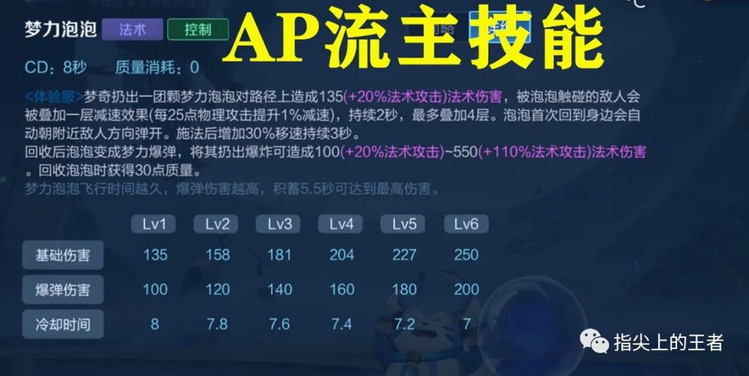 可以见到,该技能是ap玩法的主流技能,买了ap装备,连续多段输出叠加起来的伤害并不低,可是该技能满级也有7秒的冷却,尴尬的点就是如果你真的出了AP,那么伤害比不上常规法师,cd又比较长,要么开大遛弯骚扰,要么就要等第二个cd,对面魔女护盾可能早就好了。