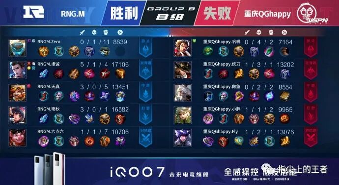 大家好我是指尖,经过几周的火拼,kpl常规赛第二轮也即将收官,目前B组的比赛全面落幕,QGhappy3:2战胜了rngm,宣布了rngm在积分上超过了vg,有了卡位赛的资格。