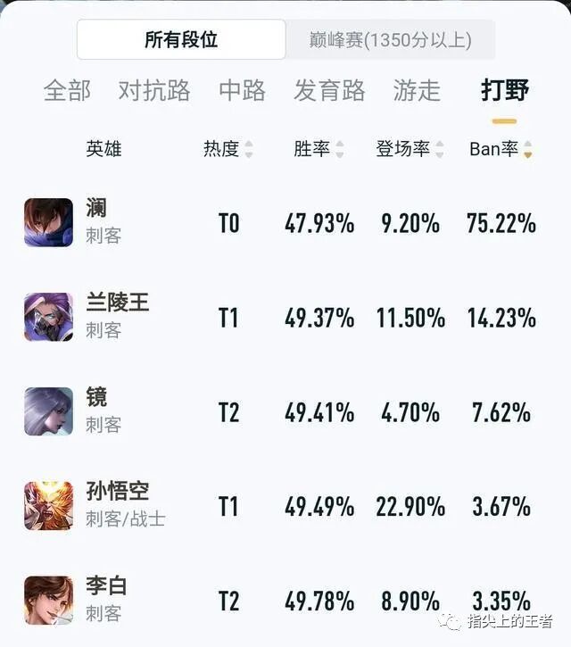 但是目前澜的胜率是全方位垫底,从全段位,到巅峰赛1350,再到顶端局,都是打野胜率最低的英雄,所以现在的澜真的还配得上这个ban位吗?