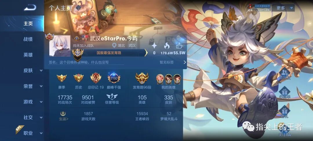 本赛季199场巅峰赛,69%胜率,综合评分80.7,超过了易瞳不少,但是君诏的国标真的不多,只有一个马超和一个关羽,前者19327分,关羽18493分。