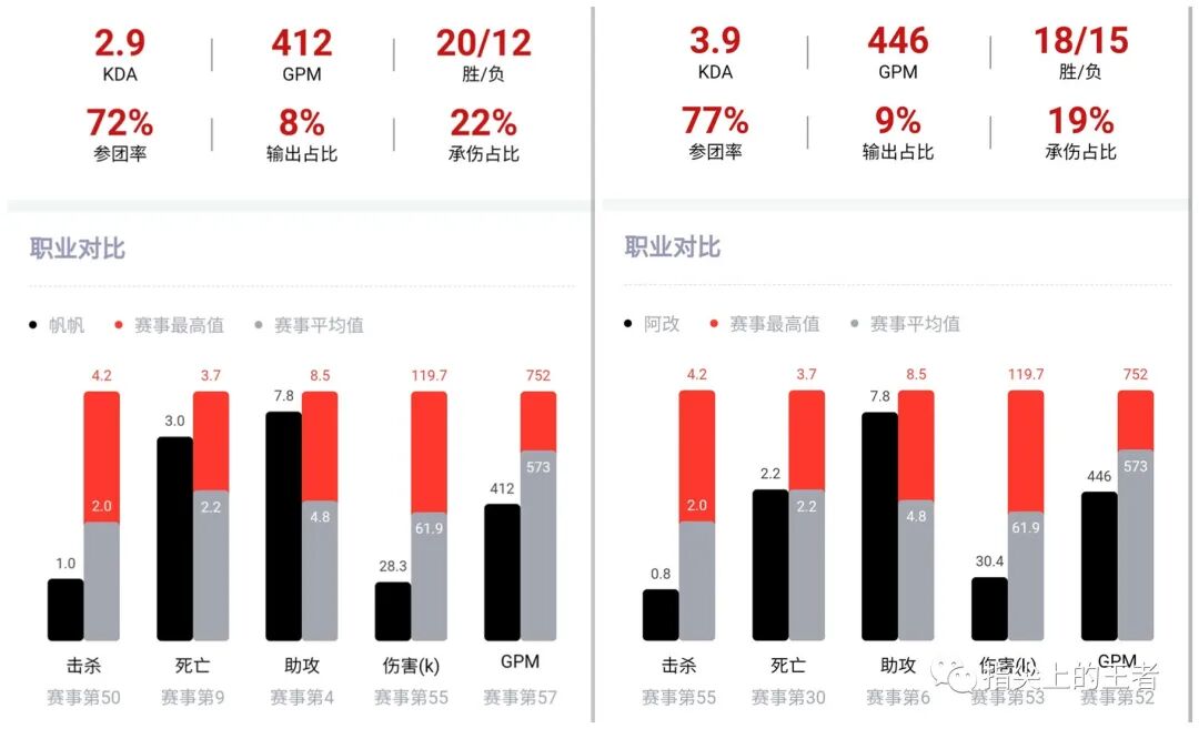 数据来看,阿改因为参团率高,导致分均经济也更高一点但帆帆的承伤能力却比阿改还要高,这是怎么回事呢?看了下英雄池,除了常规的辅助外,阿改还拿了好多次兰陵王和墨子辅助,而帆帆最多也只是用了孙膑这样的软辅,因此英雄坦度的差距,导致承伤比例更低。