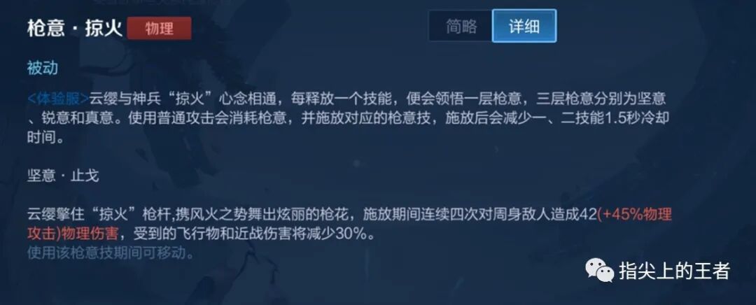 掠火枪法,是云缨独有的绝技,地地道道的中国枪,而她的被动技能属于主心骨技能,每次释放技能都会获得“枪意”,一共可以获得三种,使用普攻则可以直接释放,叠加三层枪意获得的普攻效果也是不同的,下面指尖会在123技能中分别给大家演示。