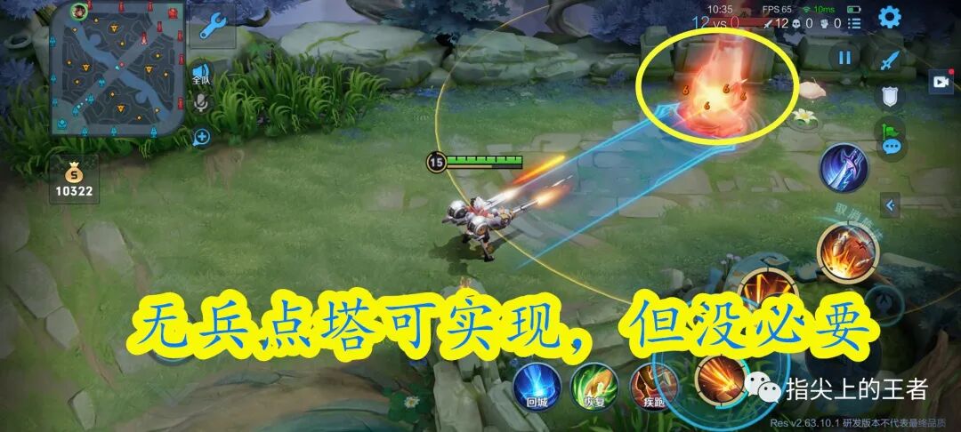 另外大家可能已经看到了,蒙犽的1技能射程远比普攻长,已经可以塔外点塔了,在4分钟的格挡期中,塔外点塔只能造成3点伤害,解除了格挡之后能否实现快速无兵推塔呢?