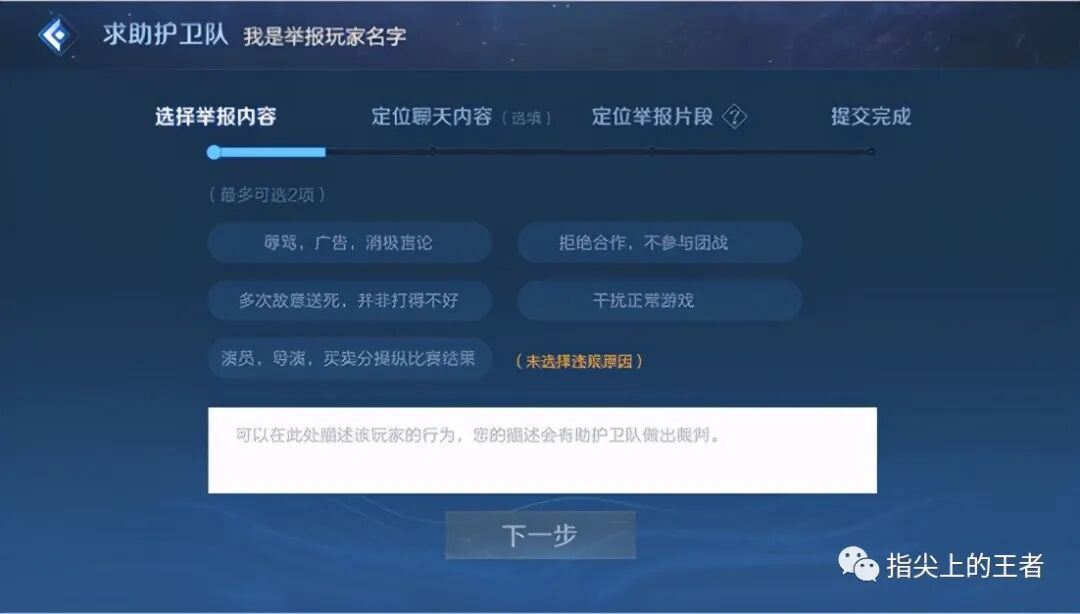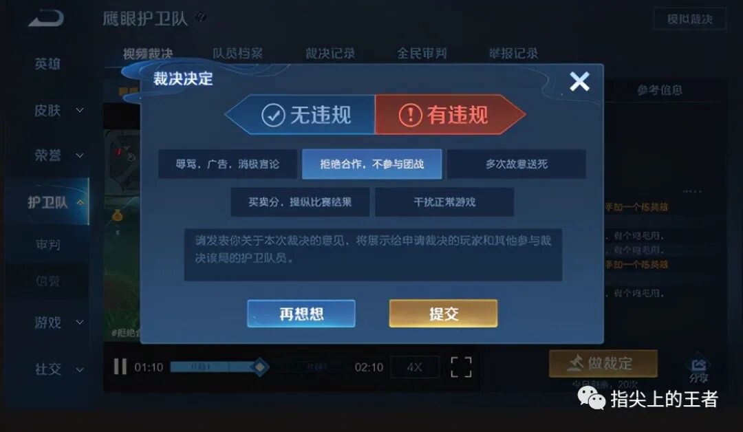 所谓的全民审判,就是在主页面板中的“护卫队”界面中,在每个判定行为中可以进行你的判断,有违规和无违规两个选项,下方也可以填写你的理由,而我们判断是否违规的依据包括举报描述、聊天记录、护卫队观点、对局信息四大模块,足够我们掌握足够多的证据。