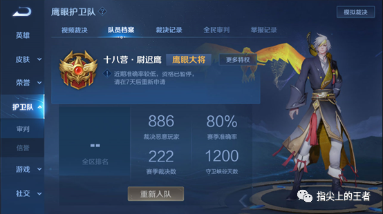 那么加入鹰队有什么好处呢?在你成为鹰队的瞬间会有一个独立的名号,比如上图中的“十八营.尉迟鹰”,在刚刚进入游戏有会出现xxxx守护本局秩序,也就是说告诉那些不法者,这局有人监管,你最好老实点,所以指尖也在想,是否以后匹配,除了按照常用英雄,还要均匀分配鹰队的成员呢?