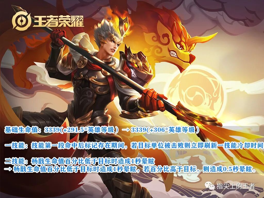 这次的杨戬除了保留了1技能的刷新机制,2技能的固定控制外又新增了一个血量上限的加强,每级增加14.5的血量,那么满级共增加了203的血量,虽说是蚊子腿,但毕竟是肉,好歹也是加强,综合来说杨戬或许有机会出山也说不定。