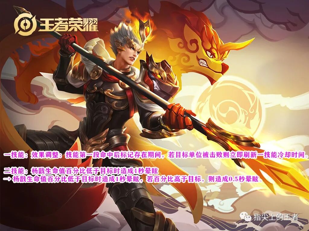 杨戬在经历了n次加强之后,终于加强了一些比较实用的内容,简而言之,1技能标记的目标不论以哪种方式死亡,都会重新刷新1技能的cd,而2技能不论敌方在什么状态,都能触发至少0.5秒的晕眩,如果敌方血量高于自己,最高1秒晕眩。