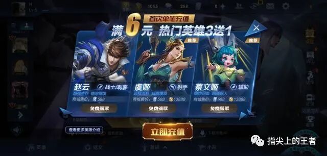 以前版本的首冲里只有一个赵云,所以没得选,后来不知道哪个版本中突然加入了虞姬和蔡文姬,而且还把虞姬放在了正中间,有不懂,刚入坑的萌新三选一,选了个波大的,结果就掉坑里了,后来才知道,蔡文姬和虞姬用金币就能买,而赵云只能花rmb买,588点券,并不便宜,或许是很多玩家打王者荣耀用点券买的唯一英雄了。