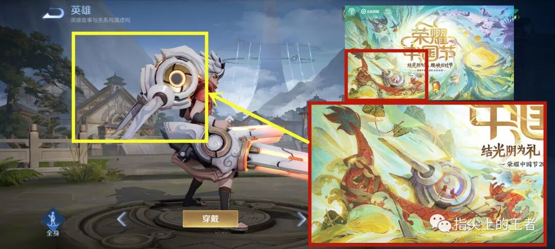 在这张图片的左上角,放大之后是一个风筝,以及一只燕子嘴里吊着一个类似信笺的东西,而在风筝的构成上我们可以看到类似一个轮子的骨架,加上这个红色的飘带,你觉得是不是很像元芳背着的这个轮子呢?