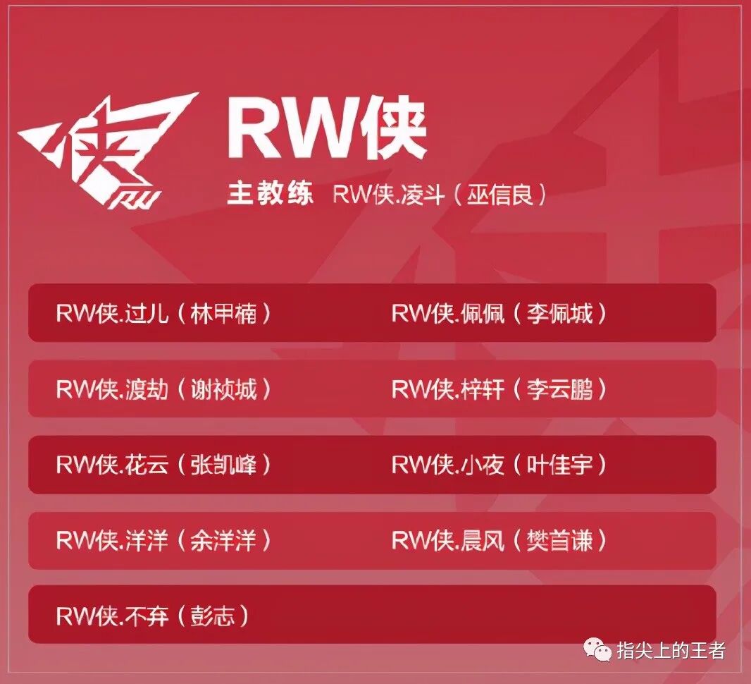 RW侠也是补足了一些新人,老选手除了去KS的冷轩,以及升级的昆昆外都在,上个赛季RW侠在凌斗带领下有了一定的 起色,这么久的休赛期,足够让他们继续磨合了,新赛季不知道是否能如凌斗教练所言,让他们脱胎换骨。