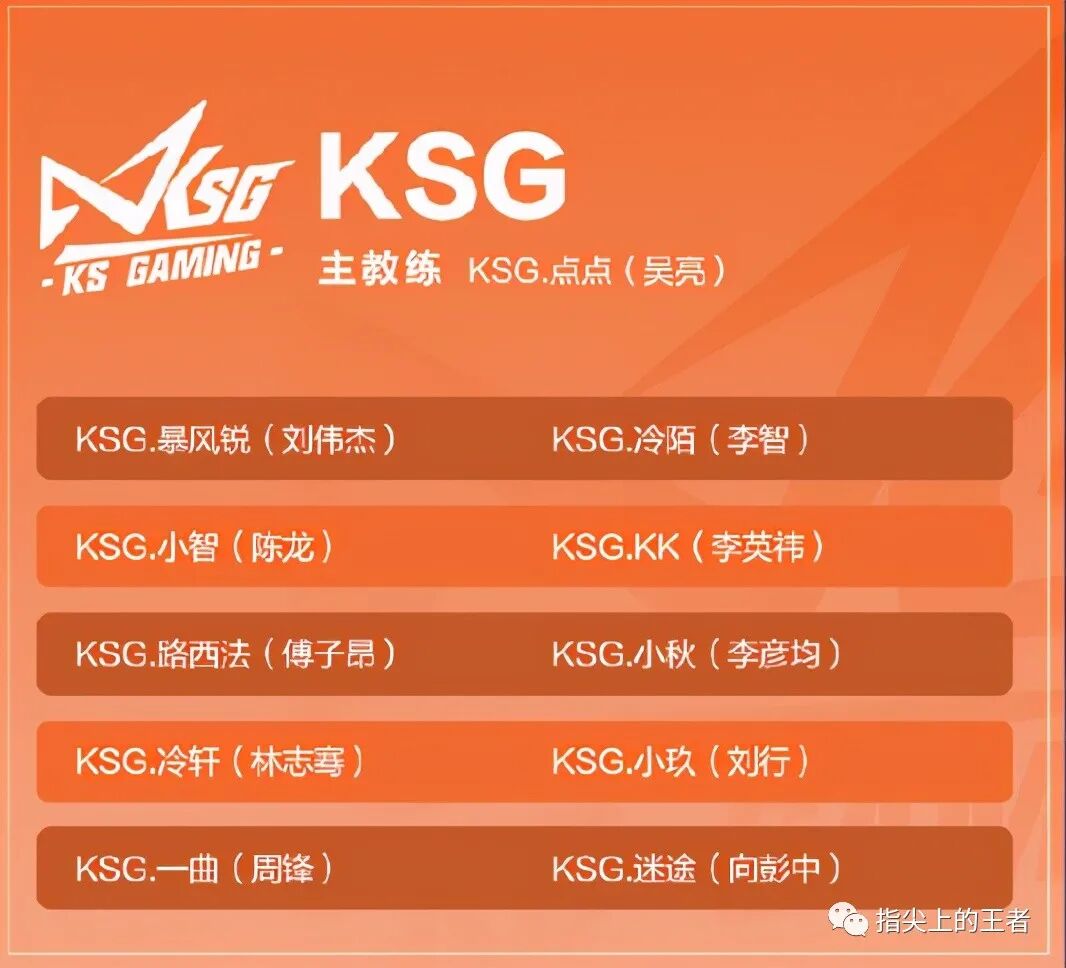 再无YTG,正式改名KSG,暴风锐的加入,带来的是青浪的退出,连大名单都没上,估计真的要退役了,路西法隔了这么久还能回归赛场真的有点意外,不过小壳沽酒也失去了大名单。边路路西法和冷轩竞争,你觉得谁能首发?