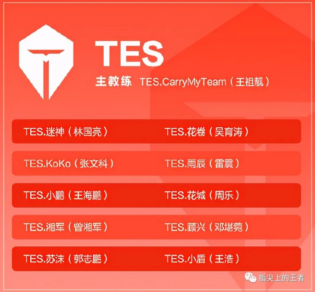 TES主教练我是真的不认识是谁,有知道的可以给我科普下,他们的主力依然没变,koko和小鹏转会失败继续留队,加入了几个新人,目前来看这个队伍还是看中单花卷吧,其他的位置都不是很看好,迷神去年后期一直替补,但据说湘军训练赛又乱杀了,不知道正赛还会不会拉胯。