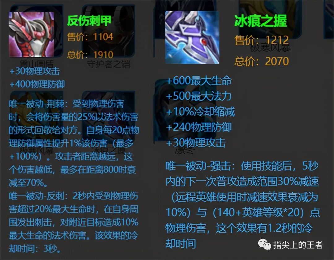 所以我的想法有两个,一个是反伤刺甲,一个是冰痕之握,肯定会有人说,这两个装备都浪费了30的物理攻击,冰痕之握还浪费了蓝量呢。