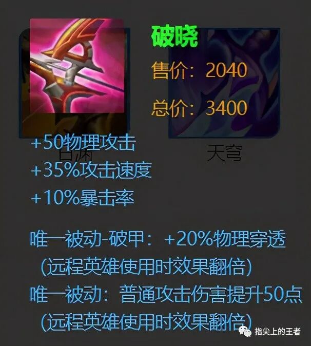 价格远超破军,属性逆天,合成平滑,因此射手因为破晓的出现,集体进行了一次升级,破晓单单一件装备就顶的上其他英雄一件半,神装比其他职业多半件装备,且是射手专属的,所以现在射手既能出破晓,也能出破军,只要有钱,属性真的可以逆天。