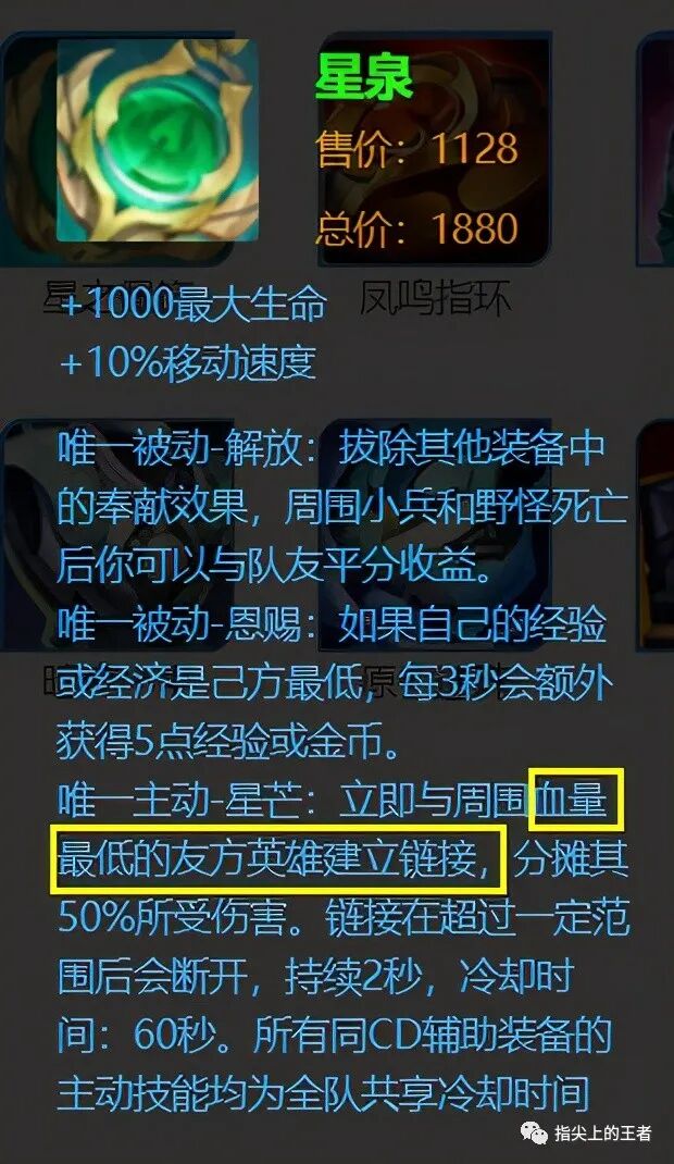 星泉的作用,先给队友增加20%免伤,后续的伤害一人一半,所以如果辅助和你保护的人同时吃到aoe伤害,那么你受到的伤害比例会非常大,所以软辅英雄吃不住这个伤害,因此这个装备几乎只能是坦克英雄来出了。