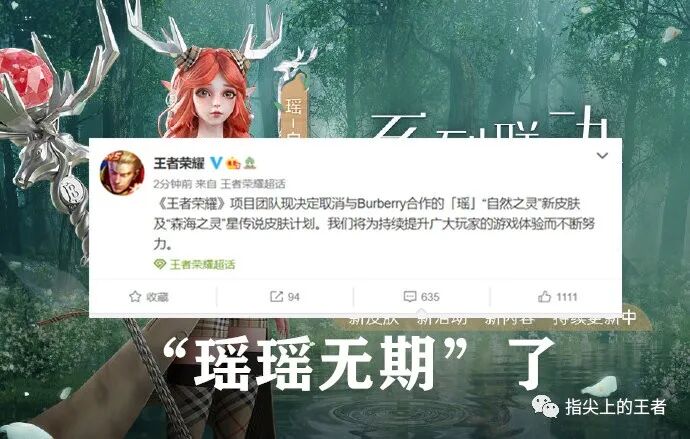 只有很短的一个声明,王者荣耀项目决定取消和burberry合作的自然之灵以及星传说森海之灵皮肤计划。