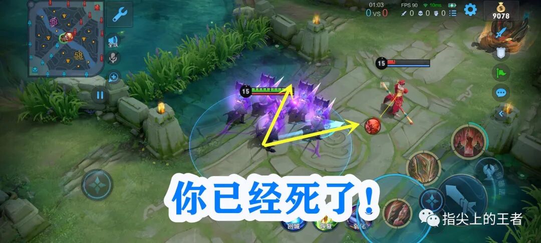 那么松开手指,再去点1技能,会直接戳出去,再执行换方向的指令,怎么办?两根手指操作,因为蒙恬本身技能机制简单,所以双指操作还是很容易做到的,具体的方法就是用食指去点击小头像,之后用大拇指滑动1技能的方向,此时你会发现,你的蓄力完全可以安排在敌人移动的方向,再也空不掉了。