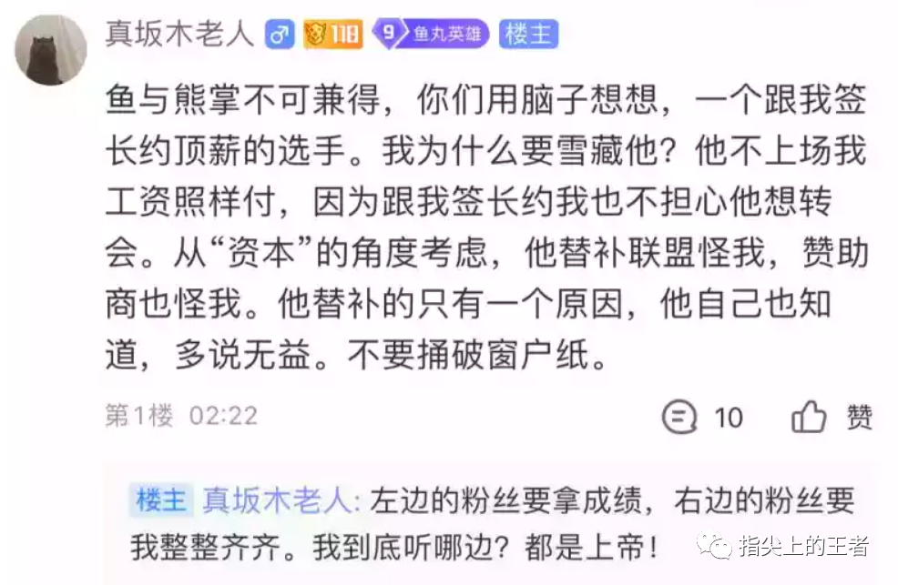 另外因为是阿泰提到的飞牛替补是俱乐部的问题,所以老板在线喊话让阿泰去他们俱乐部监督,哪里有不合理的问题他可以提出来,言外之意就是现在的俱乐部做法合情合理,都是按照流程来,飞牛替补就是正常的轮换行为。