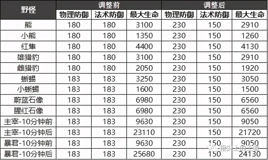 从上图可以看到,所有野怪,包括远古生物在内,全方位降低了生命值和法术防御,有玩家计算过,法师打野的速度大概会提升11%,而物理防御的加强,让传统打野的打野效率保持一致,这也证明了,法师打野会有更高的容错率。