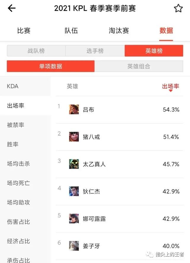 大家好我是指尖,大家有没有看本届kpl呢?指尖看了下两天的数据,有个 奇怪的现象,那就是吕布的出场率登顶了!