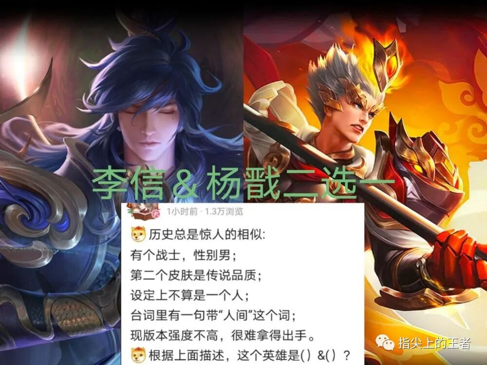前两天有博主发了个博意味深长,想要爆料却又不敢,只能用一些隐晦的方式跟玩家爆料了一个英雄或许会有新的皮肤,给出的几个线索分别是战士、男、拥有传说品质皮肤、不算一个“人”、台词中有“人间”、这个版本难出手,所以结合了上述的条件,那么结果有两个,一个是李信,一个是杨戬。