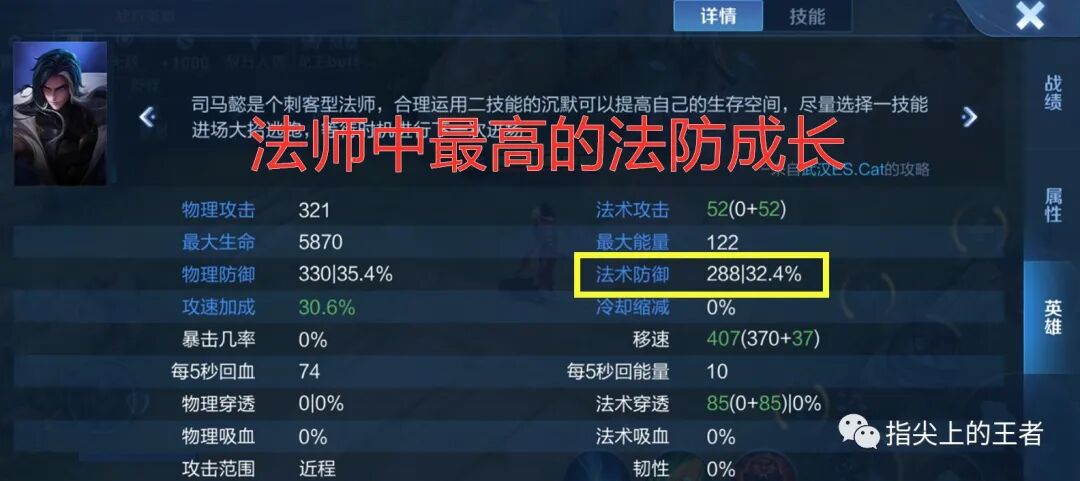 还有一点,几乎没有多少人知道,司马懿的法防成长是法师中,严格来说,应该是所有英雄中法防成长最高的英雄,包括坦克,几乎所有英雄的满级法防都是169左右,而司马懿高达288,天生对法师有抵抗能力。