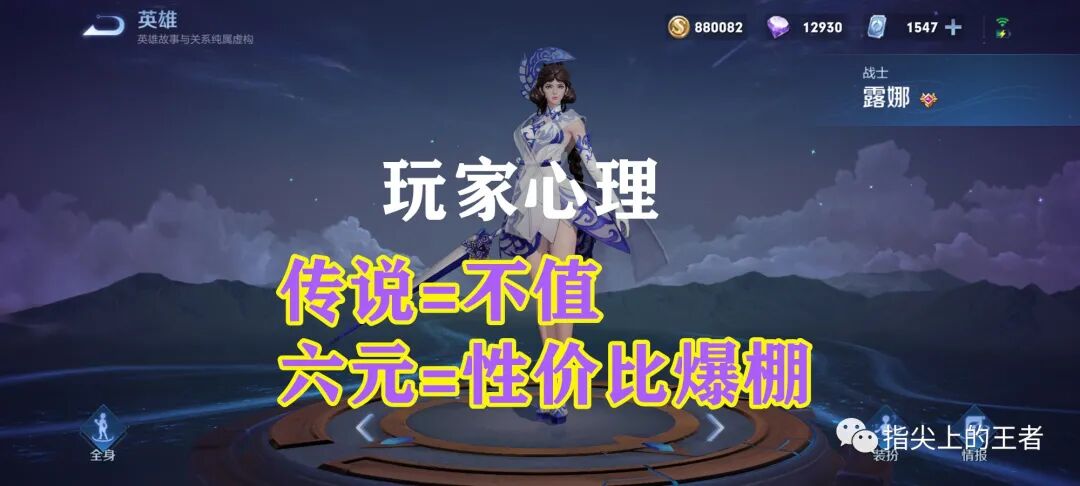 但是放在勇者中,售价六元,销售量上会有几何倍数的增长,或许销量也会高过卖传说的价格,因为什么?露娜是冷门英雄,传说皮肤只能卖给尖端局少数玩露娜的玩家,但是卖六元,之后让玩家知道这个皮肤的质量之高,不玩露娜的也会考虑收藏,你觉得呢?