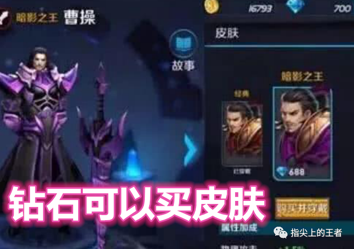 那个时候钻石的价值非常高,作为游戏内唯二的货币,金币可以买英雄,钻石则能够买到部分皮肤,而曹操的这个暗影之王并没有上线,我也是从这张图才知道,也曾有过皮肤是用钻石买的,这个时间我还没玩这个游戏呢。