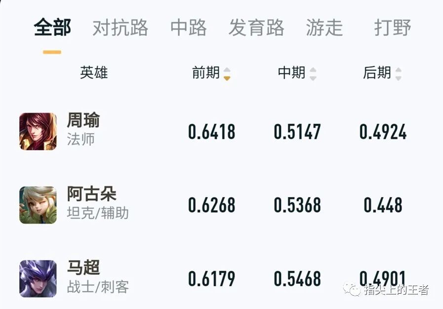 不过的确让我惊讶,前期胜率最高的英雄竟然 是他,的确,从2级开始,周瑜的强度就已经很高了,清掉兵线的速度也是无与伦比,如果此时爆发小团战,周瑜的火焰依然能够铺开很大的面积,不论是逼走位还是打伤害都是很强的。