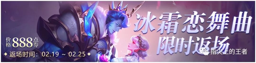 冰霜恋舞曲返场,和霸王别姬一样,这次返场将是终返,上架时间一周,价格888点券,其实一比就能看出霸王别姬的性价比,之前的史诗皮肤是788点券的。