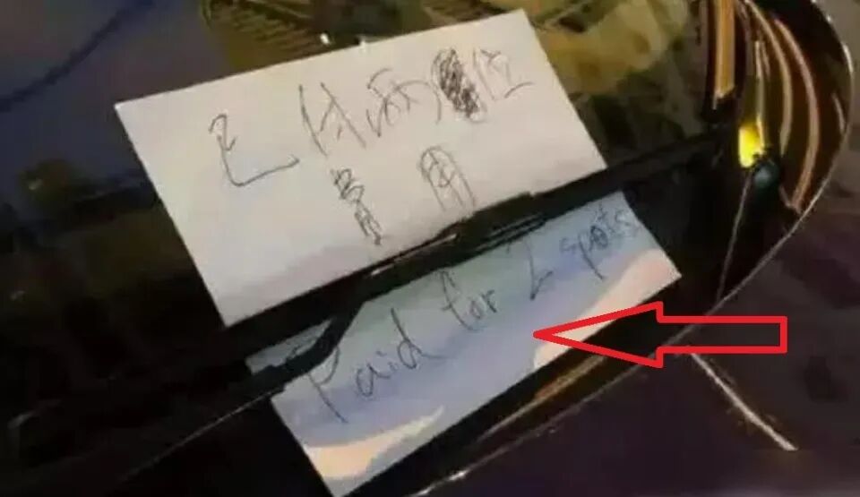 不过,如果遇到这种情况,车主们完全可以寻求帮助,有挪车电话的话直接打电话就可以,而如果没有,可以找物业帮忙,用拖车工具把车拖走。不过,这辆保时捷却不按常理出牌,虽然车上留了一张纸条,但不是挪车电话,而是写了一句让人更愤怒的话。只见纸条上写着“已付两位费用”,表明这两个车位都已经付钱了,而且还在下面加了一句英文,看起来非常洋气。