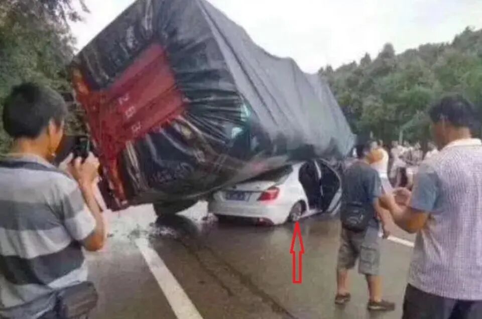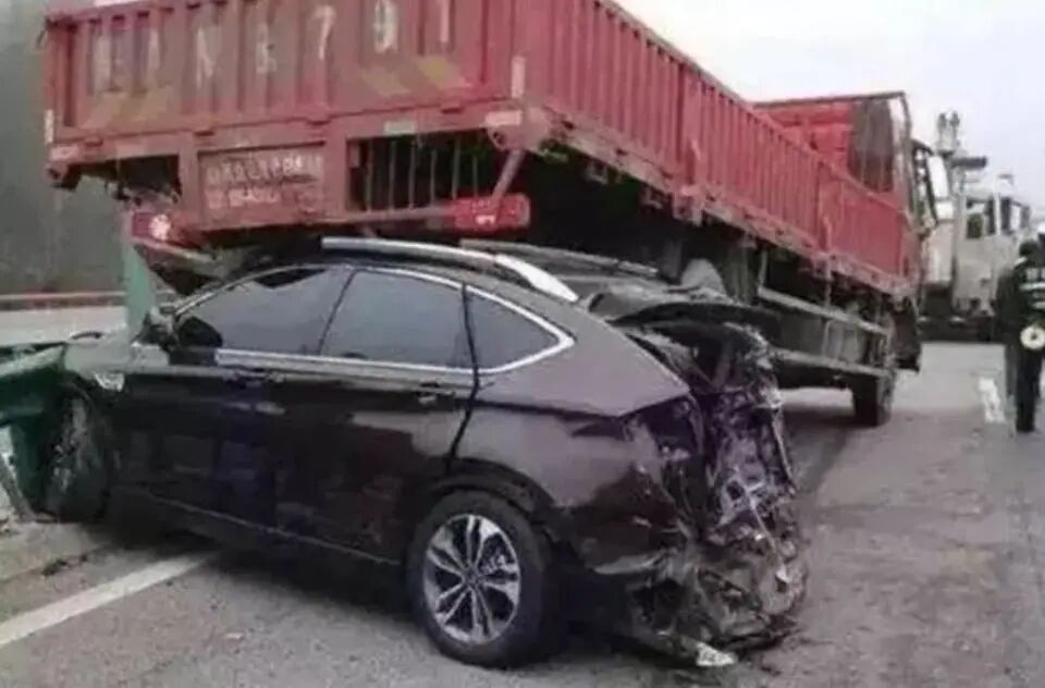 首先我们看下第一起事故。可以看到,这是一辆吉利的轿车,具体什么车型就不说了,大家都清楚。从现场可知,大货车狠狠地压在了轿车身上,而且尾箱装满了货物,大货车加上满载的货物,重量至少也有三四十吨。不过,这台吉利轿车在顶着大货车的前提下,居然只是四个轮子爆胎,车身完全下压,但车上的乘客却没什么事,只是有点皮外伤,可以吉利这台轿车的车顶刚性确实牛,质量让人放心。