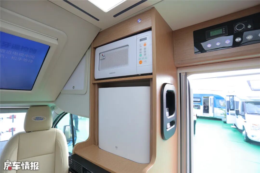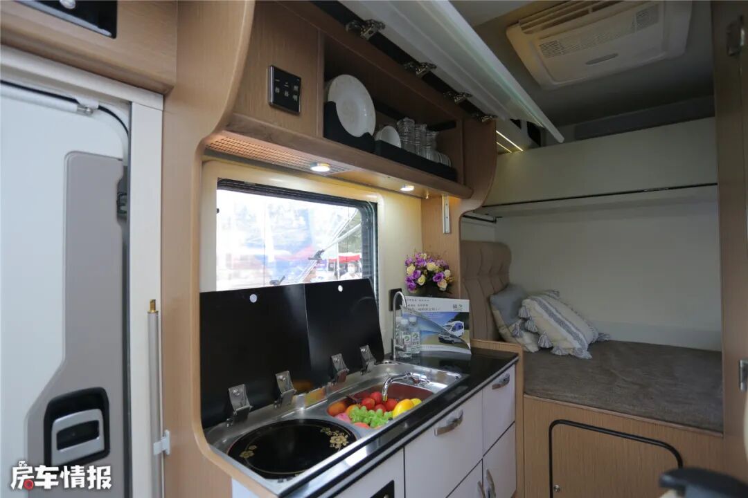 厨房区采用电动橱柜,可以电动升降,提高了底部抽油烟机的工作效率。灶台上安装了隐藏式电磁炉、隐藏式冷热水龙头+带盖水槽,除此以外还另外装备了一个鹅颈式固定水龙头,用水更加便利。副驾驶后方是另一组橱柜,安装有微波炉、净水器、房车专用冰箱等设备,与电动橱柜分列于乘客门两侧,方便使用。