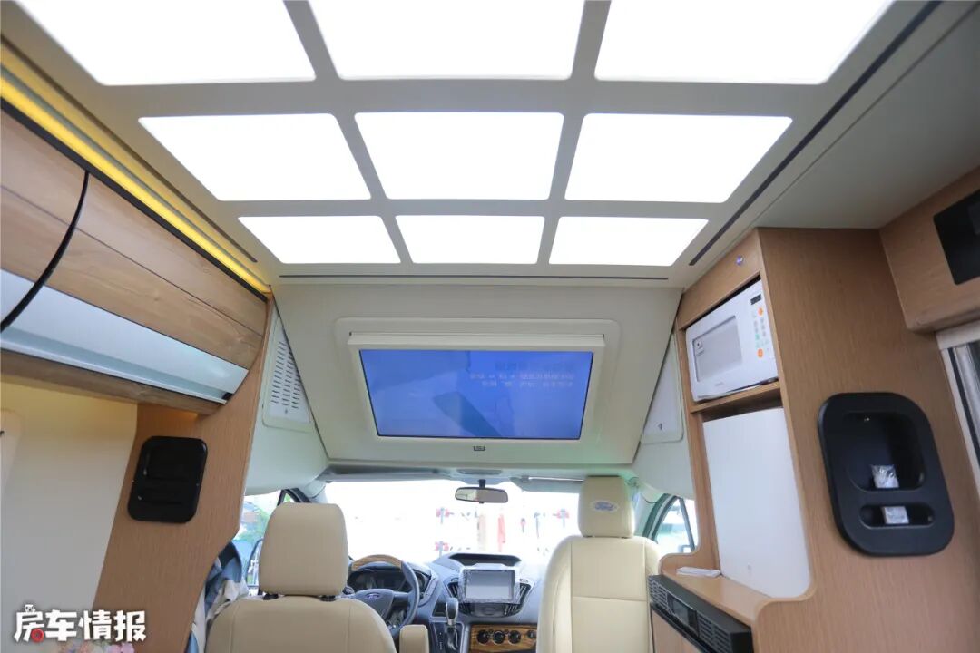 智能电视位于驾驶室和会客区的连接部位,正好贴合于额头内板弧度安装,适应车内不同的观看角度。会客区顶部采用九宫格吸顶LED灯,商务范十足。