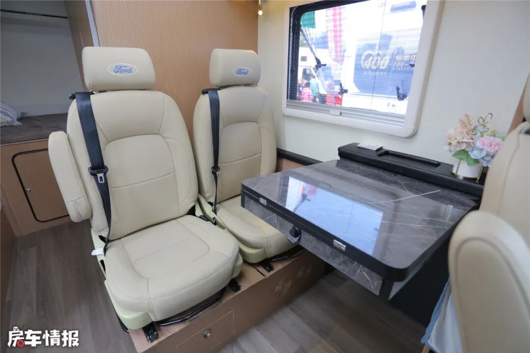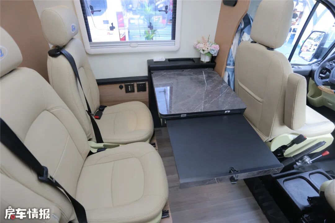 会客区在驾驶室旁边,主副驾驶椅还可以旋转过来,两排航空座椅组成四人对卡座形式。后面的座椅配有安全带,行车过程中也能乘坐。中间采用电动小桌板,使用的时候按一下电钮,就可以打开。打开延长板,就可以当成茶桌或者餐桌使用了。