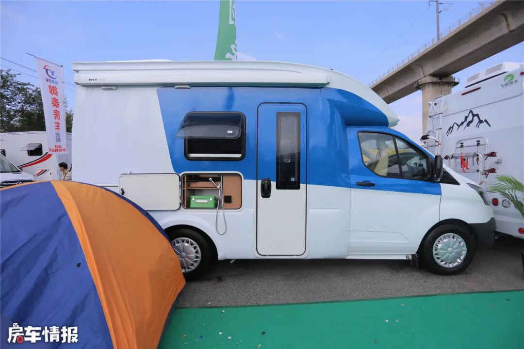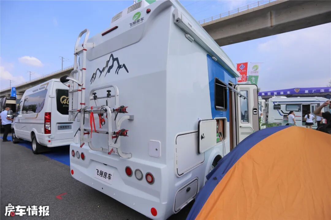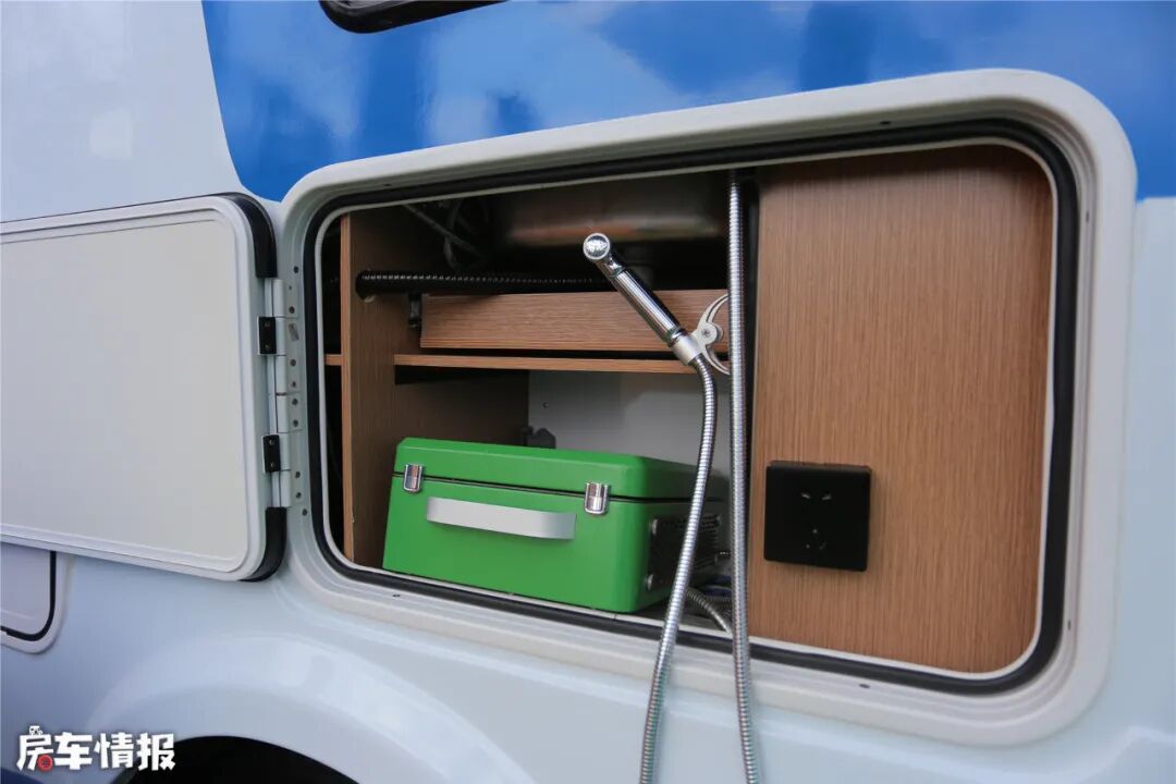 车辆外部提供了户外遮阳棚、加水口、220V电源接口、便携式炉灶、外置淋浴等一些基本设备。车尾部还安装了自行车架和后爬梯,非常实用。