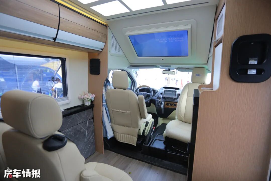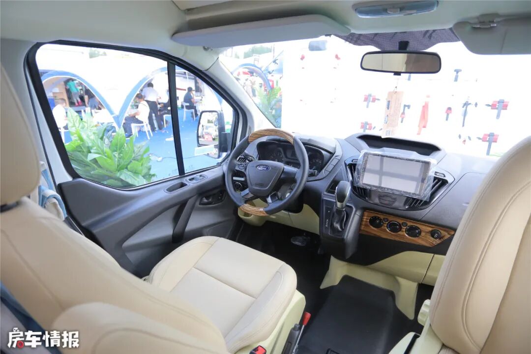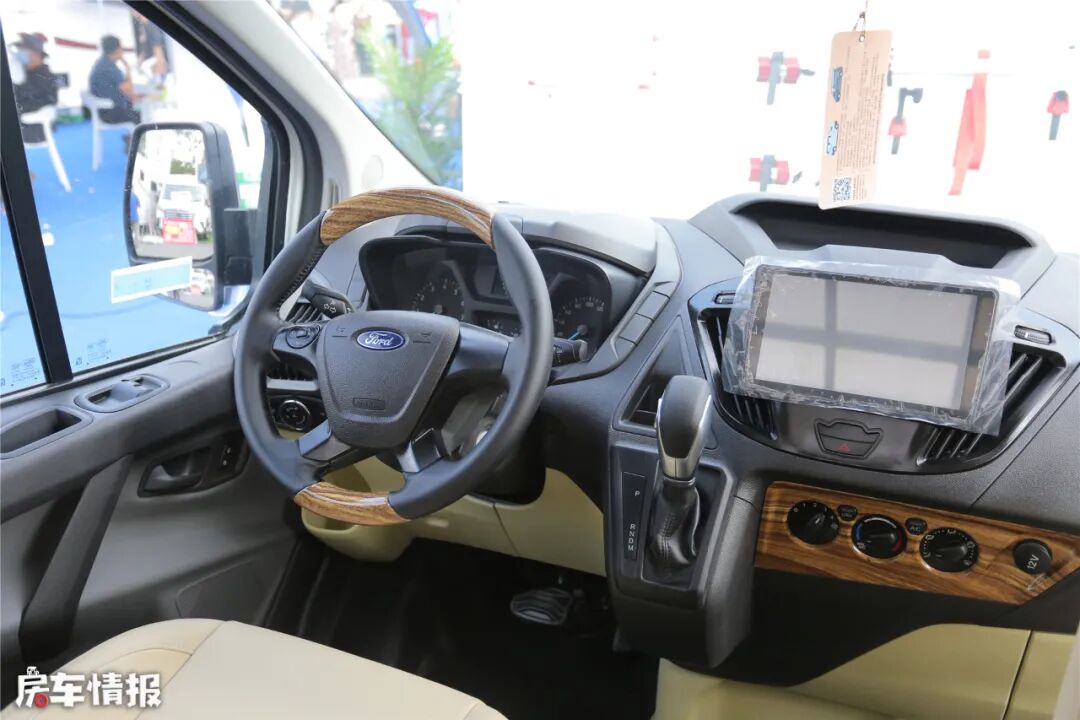 进入房车内部,驾驶室能布局比较清晰,中控大屏,拍档杆位置比较显眼,距离驾驶者比较近,操控方便。方向盘和面板上加入了一些木纹质感的点缀,显得更加豪华和时尚。