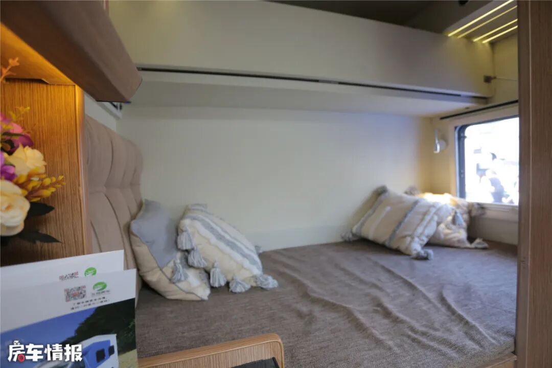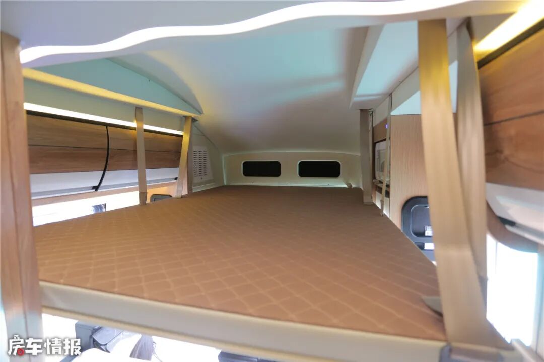 会客区车顶部,设置了一张升降双人床,这便是此车的第二个休息区。晚上按一下开关,就可以今夜好梦。与主卧大床一起,本车可供4人休息。