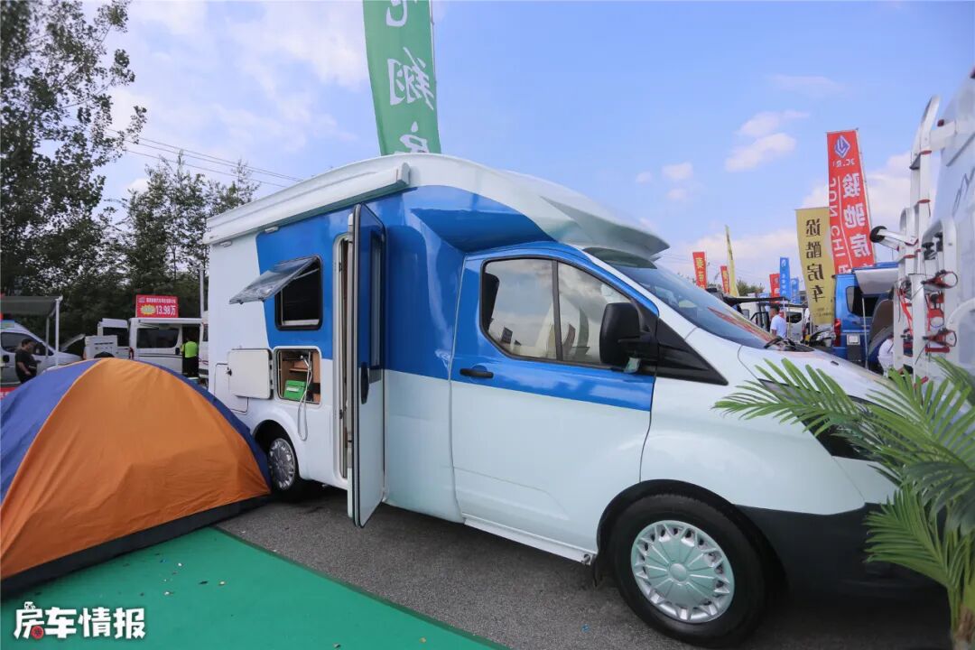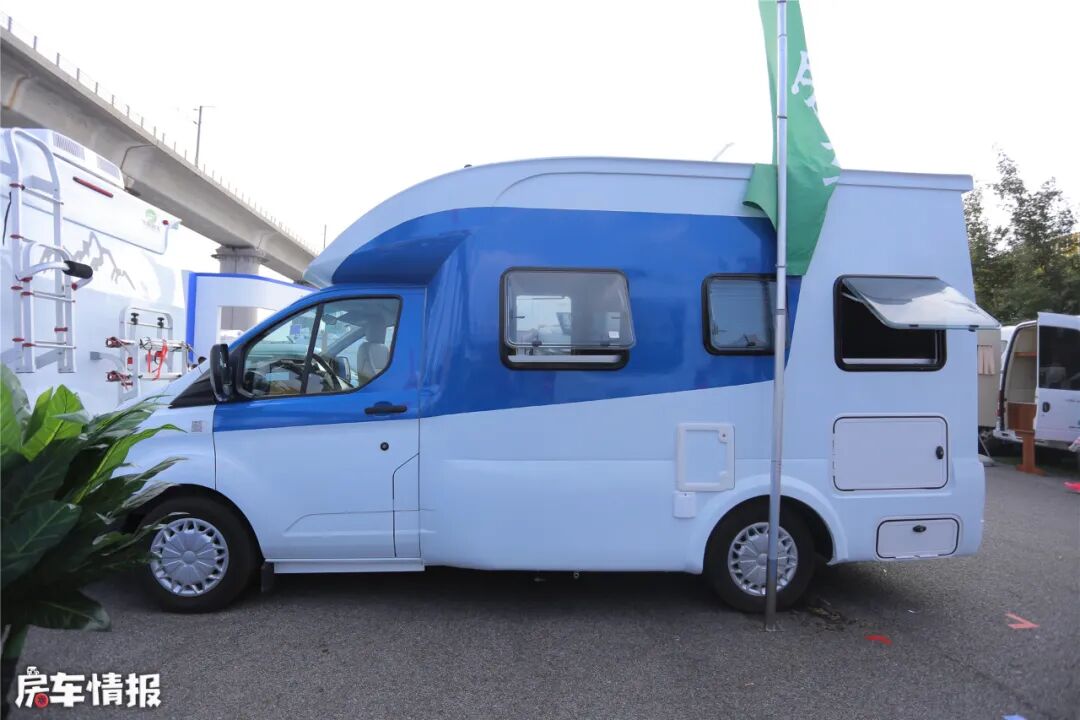这款房车的外观流线型的小额头设计,与前挡风玻璃形成弧形,不仅看起来够时尚,还能减小空气阻力,提高安全性。整车采用蓝白相间的车身涂装,色系明亮,图案简约却有内涵,寓意在蓝天白云中尽情飞翔。