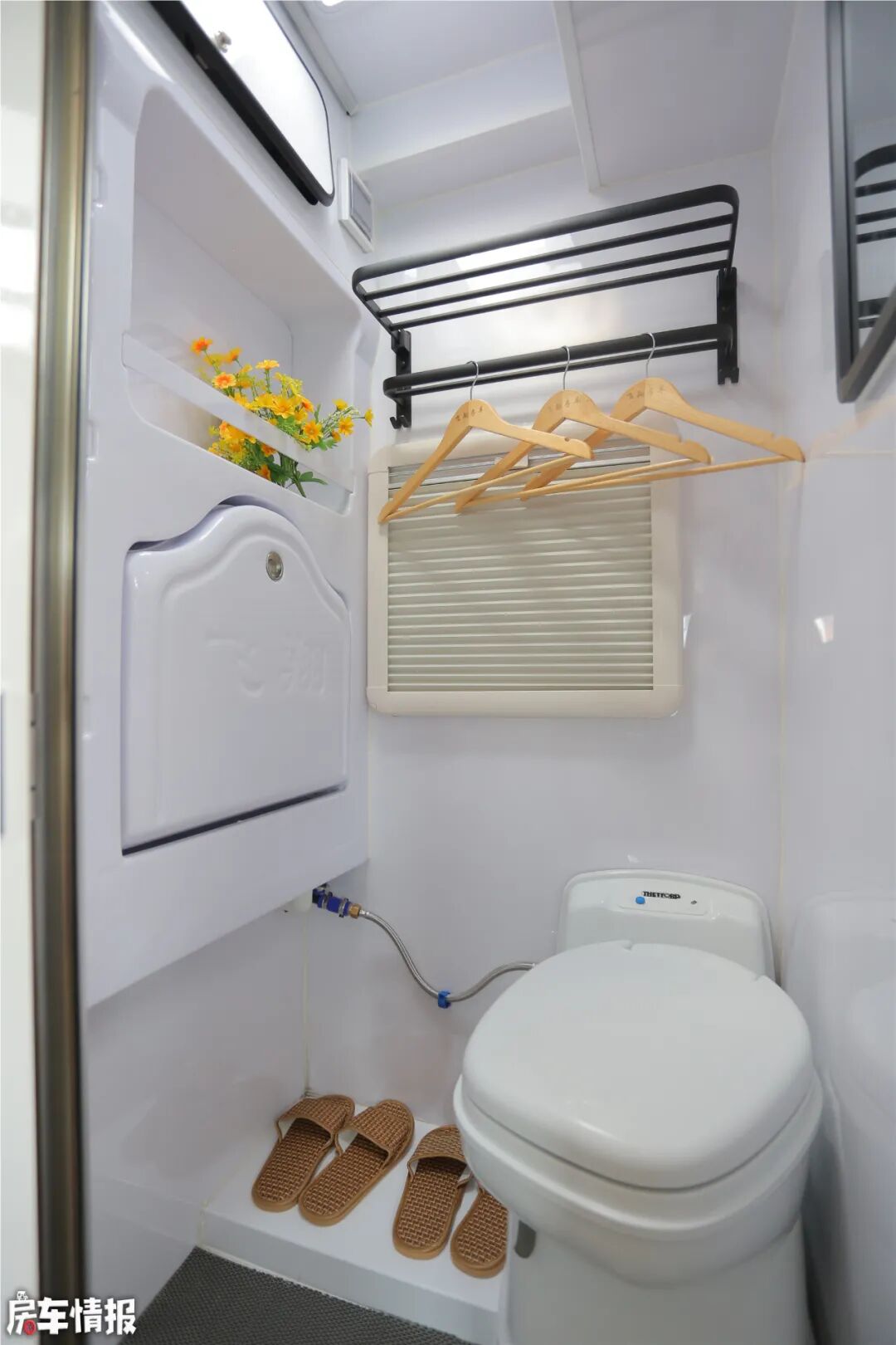 卫生间位于车厢中部,内部提供了挂衣杆、盒式抽拉马桶、淋浴喷头、折叠式洗手盆等,功能丰富,空间大小正好供单人使用。