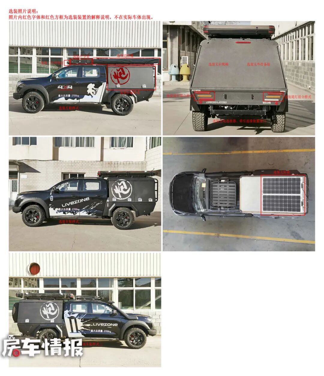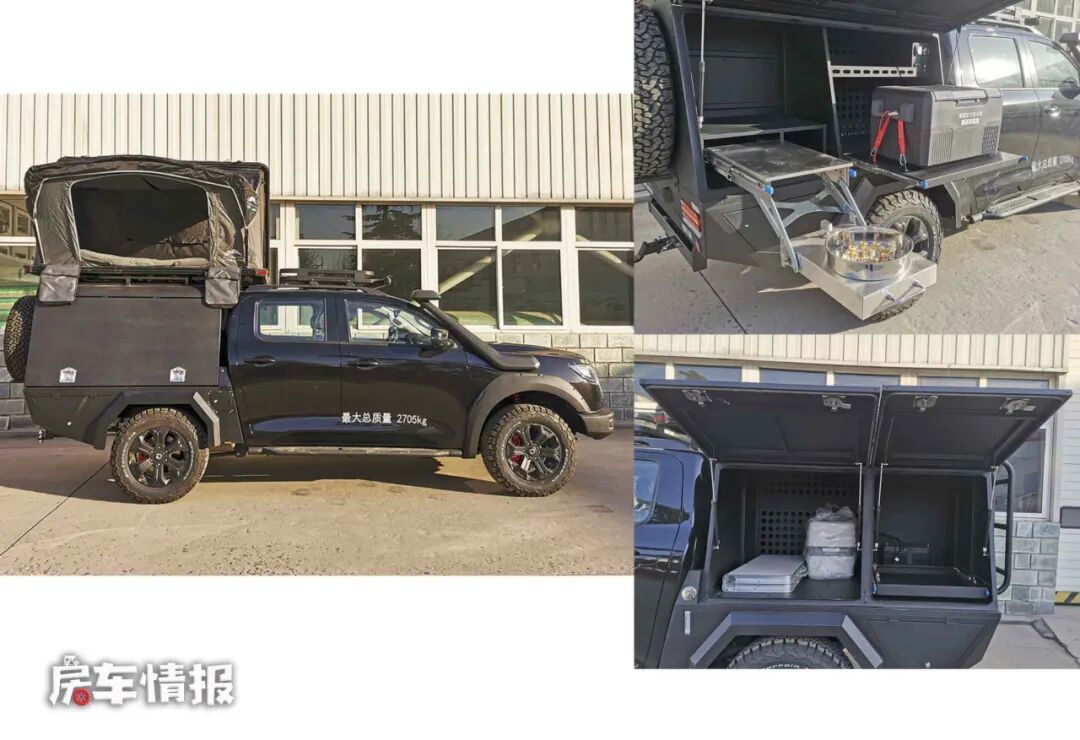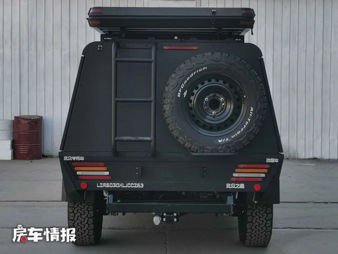 在车身后部的车厢内还可选装抽拉燃气灶、车载冰箱、发电机等生活设备,车顶部还可选装车顶帐篷,作为休息使用。