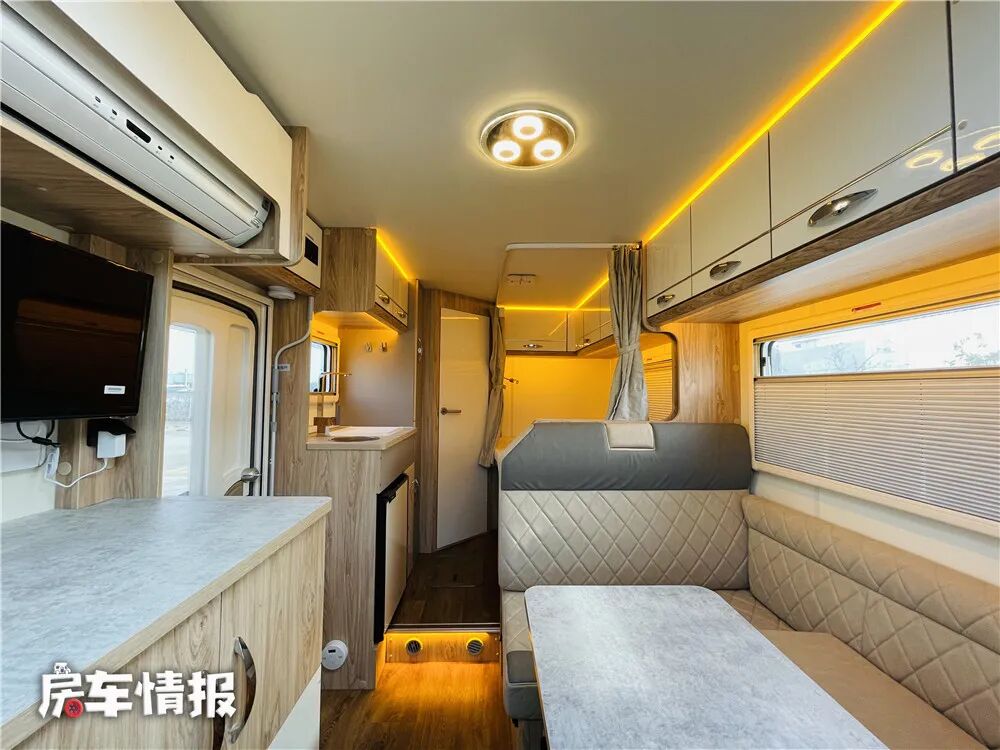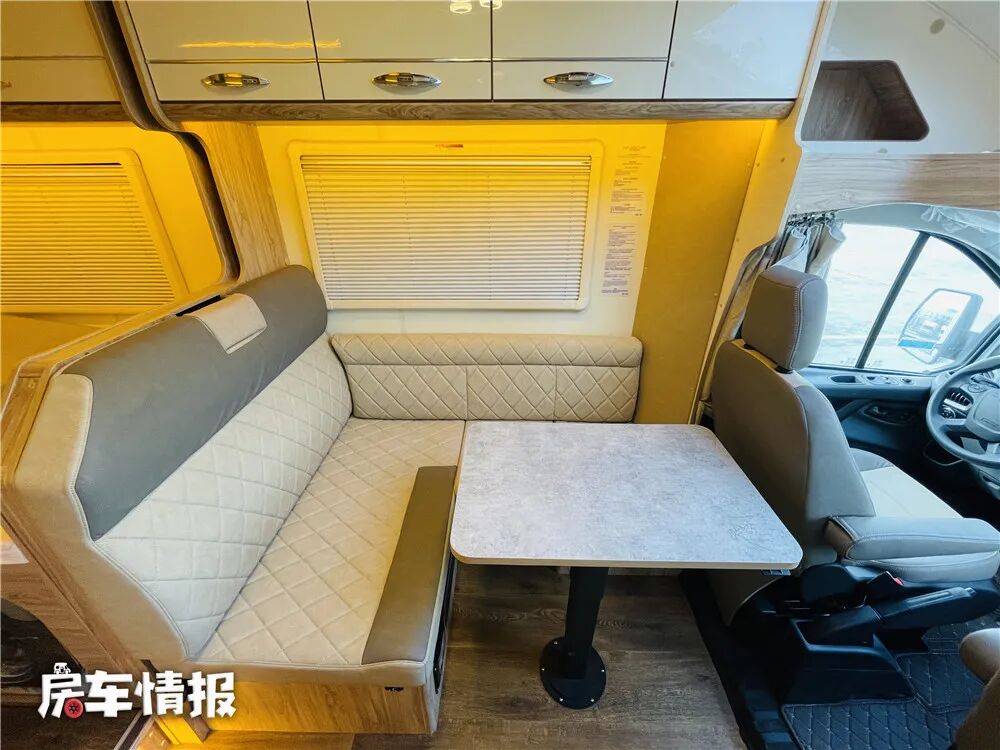 来到生活区,由于采用了C型车身设计,为此车内的空间比起同底盘的B型房车明显要大了不少,前后贯通式的布局显得比较通透。