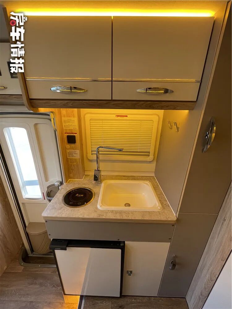 车内的厨房位于车厢中门后方,位置比较常规,厨房内提供了洗菜池、电磁炉、储物柜、85L房车专用冰箱等基础设备,能够满足日常使用。