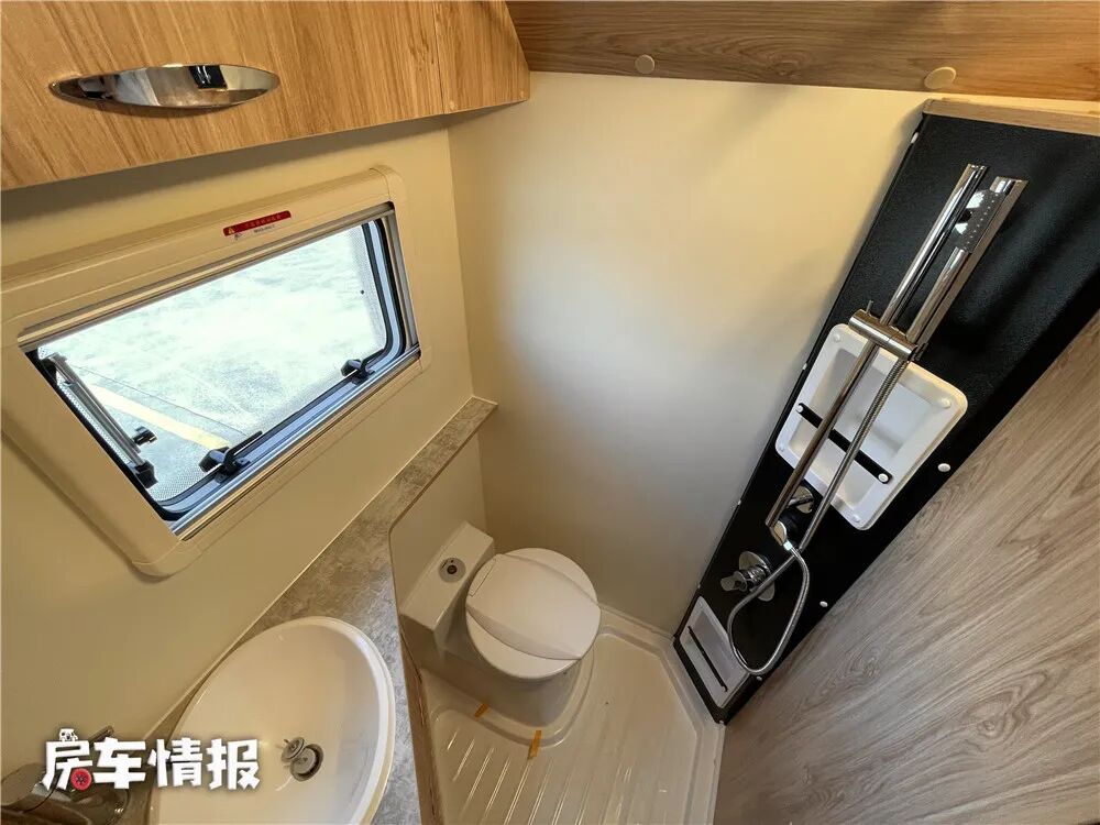 卫生间位于车厢尾部,内部空间表现还不错,提供了盒式马桶、梳妆镜换气扇、独立淋浴等设备,搭配上旌航专用25L热水器以及160L净水箱和445L灰水箱,基本上能够日常洗漱问题。