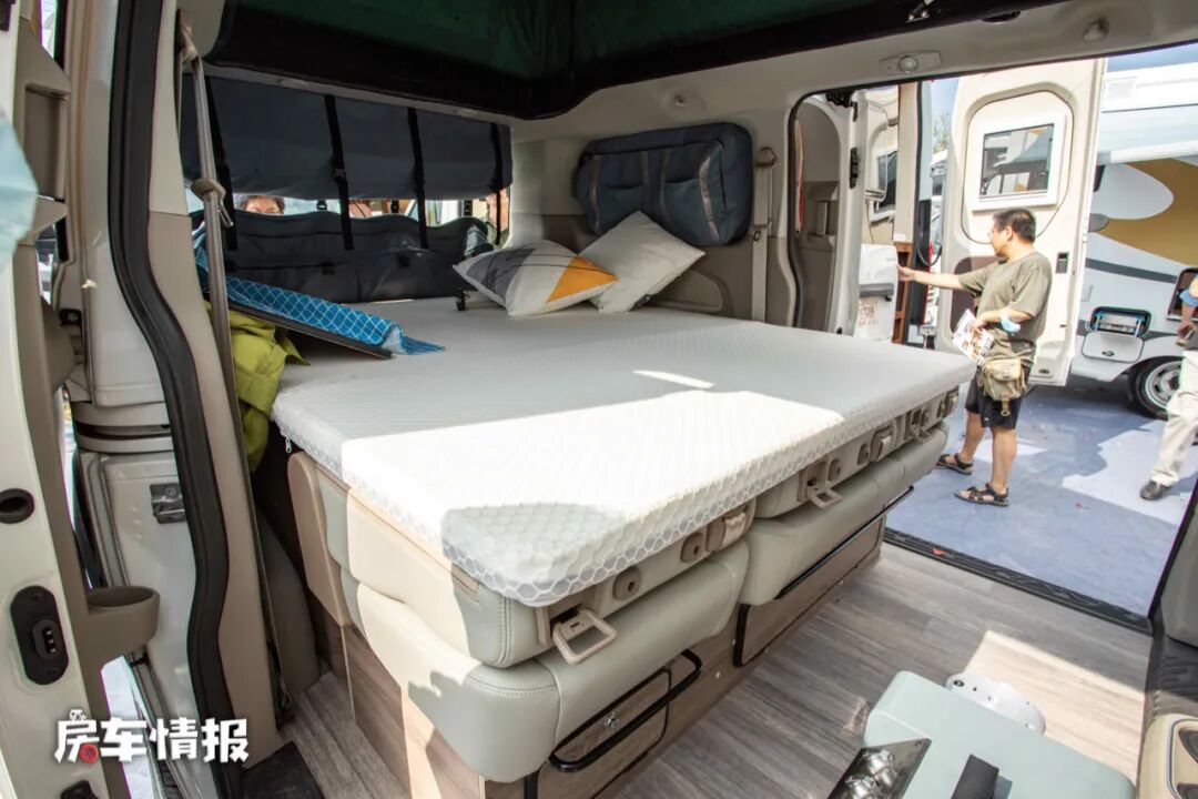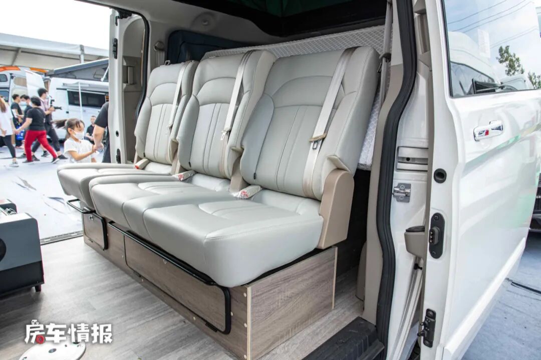 驾驶室后排的设计保持了原有的风格,并排的三个沙发座椅,并且全部配有安全带,所以在平时上路行驶时是可以坐人的,舒适度也非常好,就和普通的MPV一样,而晚上需要休息时,就可以把座椅翻折成一张尺寸为2000*1600(mm)且的双人床,座椅背后带有床垫,所以非常的平整,不用担心躺着不舒服的问题,而且尺寸能够容纳两个成年人休息。