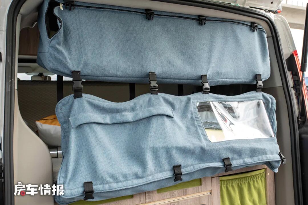 还有一个贴心的设计是在厨房区的上方提供了一个大型的收纳袋,不仅巧妙的分隔了厨房区和休息区,而且能够阻挡油烟进入车厢内部。收纳袋的尺寸很大,拿取也很方便。