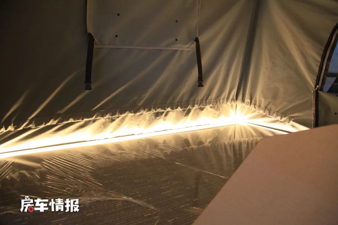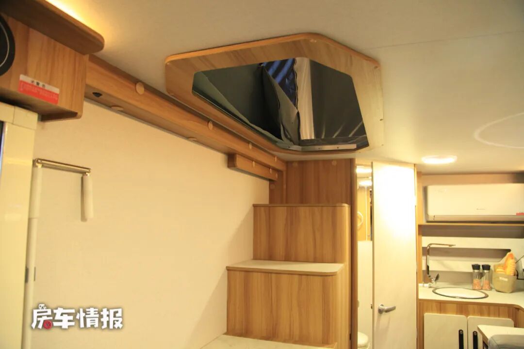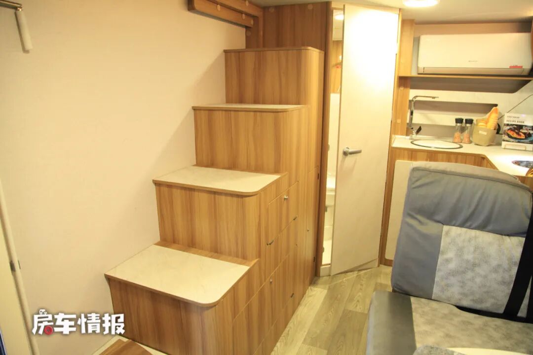 最后要给大家介绍一下这款房车内部比较新奇的设计,就是在乘客门的左侧设置了一个楼梯式的储物柜,平时可以储存物品,晚上需要休息的时候,就将升顶打开,走上楼梯就可以到达升顶内的休息区,里面包含了一张大尺寸的双人床尺寸为2200*1600,采用的是布艺床垫,平时能够容纳两个人休息使用。