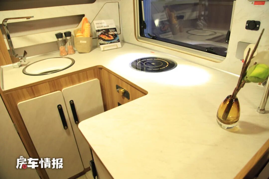 会客区的后方是整车的厨房区,采用了一圈U型的厨台设计方式,台面的面积也非常的大,左侧提供了一个带盖的水槽,中间为电磁炉,右侧则是一块空置的桌面,平时可以放微波炉或电饭煲,但是行车时需要固定好。